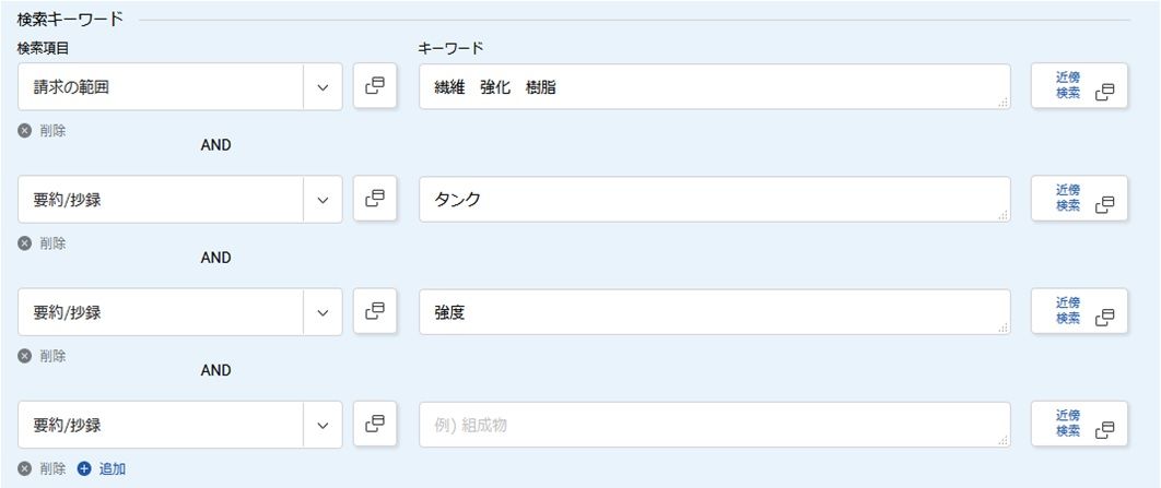 請求の範囲に「繊維 強化 樹脂」としました。要約には「タンク」と「強度」を入れています。「繊維 強化 樹脂」という単語は物の構成ですので請求項に、「タンク」を要約にしたのはそんなに深い意味はありません。請求項に入れてもいいと思います。ただ、「強度」については効果ですので通常、請求項に記入しないため要約から検索する必要があります。このように構成や用途、効果をキーワードとして選びつつ、適した検索項目にあてはめます。