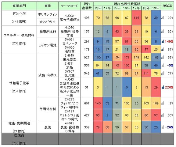 表の見方を説明しますと、各事業部門ごとの事業に関する特許分類(テーマコード)の出願件数(2013年~2019年)と年ごとの出願件数をヒートマップという形で示しています。出願件数が多い年は赤いセル、少ないものは青いセルであらわされています。年ごとの変化が青→赤に変化している分野は近年、特許出願件数が増加しており、研究開発が活発であることが直感的に分かります。逆に赤→青に変化している分野は特許出願件数が減り、研究開発が進んでいない可能性があります。増減率は2013年~2015年までの出願件数と2016年~2018年までの出願件数を比較した際の増減率となり、近年の活発度を表す指標としています。