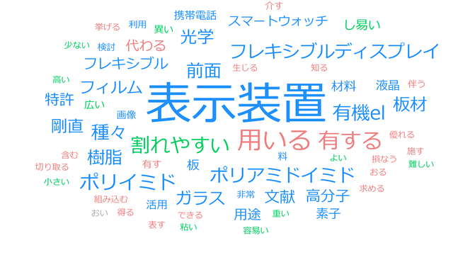 「表示装置」を中心に様々な用語が並んでいますが注目したいのは「フレキシブル」や「剛直(柔軟性がないこと)」などの「フレキシブルディスプレイ」に関係すると思われる用語が複数あり大きいこと。公報を1件ずつ読み込んだわけではないので確定はしませんが、住友化学は有機ELの開発に軸足を移すとともにフレキシブルディスプレイについての開発を強化テーマとしている可能性が高いことが分かります。