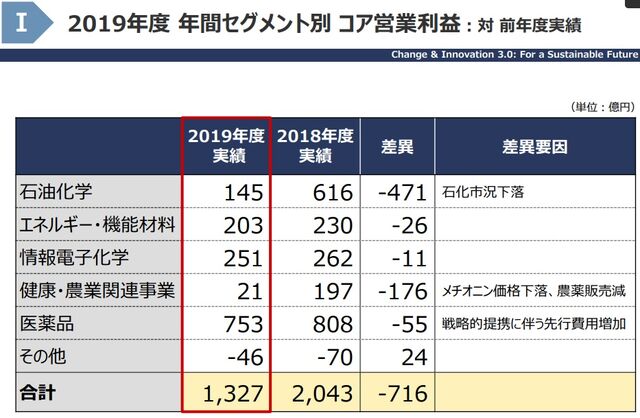 国内2位の総合化学メーカーということで多様な事業を展開しています。主な稼ぎ頭は石油化学と医薬品ですが、2019年度は石化市況下落によって大幅に営業利益が下落してます。