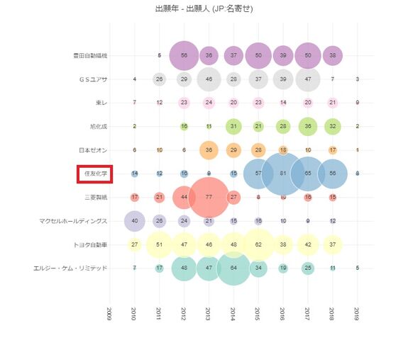 住友化学はLGに次いで権利数で2位につけています。現時点で多くの特許を保有している上に、直近の出願件数も多いことから、このまま順調に特許を取得できれば競合メーカーとの競争優位が築ける可能性がグッと高くなりますね。