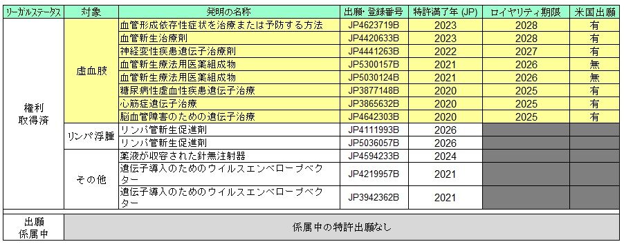 DNAワクチンはIR資料にもあった通り、高血圧を対象とした特許が取得できたみたいですね。これで臨床試験の結果がでれば上市でき、ロイヤリティを得る可能性がでてきます。またIR資料に出ていない内容として、高血圧のほかにも癌や動脈硬化症を対象とした特許を取得しています。
