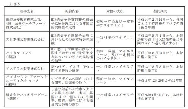 2)現状、ロイヤリティが得られる状況にあるHGF遺伝子治療薬(コラテジェン)についても、ロイヤリティが得られるのは早くて2025年まで、長くても2028年までと考えられる。
